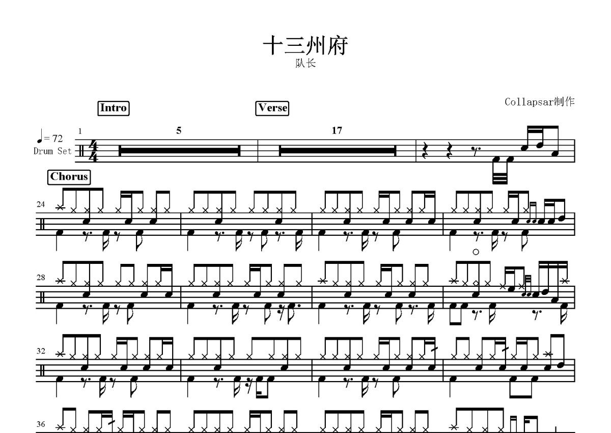 《十三州府》是队长演唱的一首歌曲,这份鼓谱共有一张高清图谱,图谱由 @打鼓谱 编配上传,图谱使用五线谱编配,使用这份十三州府架子鼓谱,你将能够轻松地敲打出这首队长的十三州府,快来尝试吧。队长 - 十三州府。