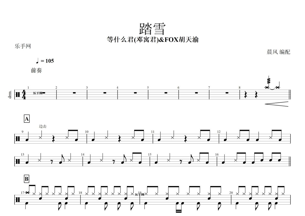 《踏雪》是等什么君(邓寓君)/FOX胡天渝演唱的一首歌曲,这份鼓谱共有两张高清图谱,图谱由 @打鼓谱 编配上传,图谱使用五线谱编配,使用这份踏雪架子鼓谱,你将能够轻松地敲打出这首等什么君(邓寓君)/FOX胡天渝的踏雪,快来尝试吧。此谱出处来自乐手网分享,需要更多鼓谱定制请到乐手网。 《踏雪》是夜小末、Fox胡天渝、满杰Babycloth作词,满杰Babycloth、Fox胡天渝作曲,等什么君(邓寓君) /FOX胡天渝演唱的歌曲,发行于2021年12月4日,收录于专辑《予·君》中。