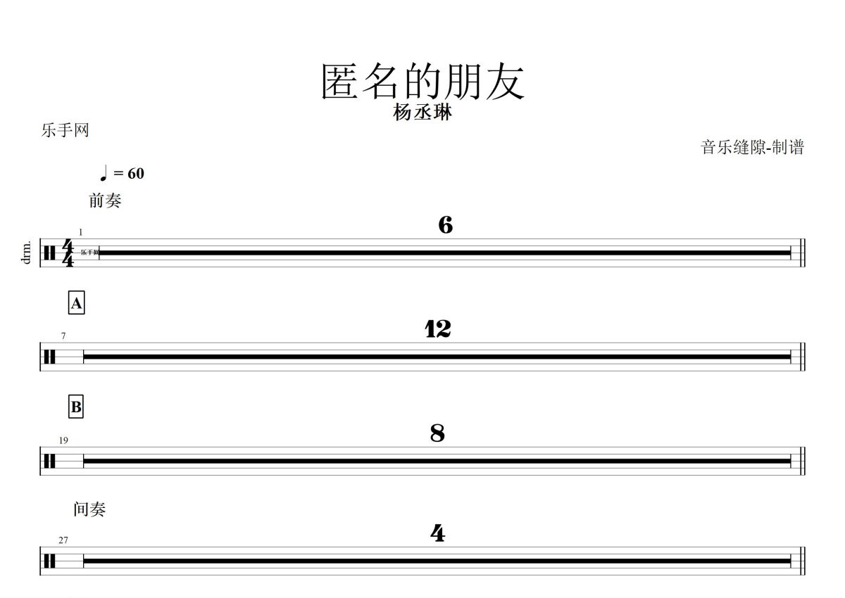 《匿名的朋友》是杨丞琳演唱的一首歌曲,这份鼓谱共有两张高清图谱,图谱由 @打鼓谱 编配上传,图谱使用五线谱编配,使用这份匿名的朋友架子鼓谱,你将能够轻松地敲打出这首杨丞琳的匿名的朋友,快来尝试吧。此谱出处来自乐手网分享,需要更多鼓谱定制请到乐手网。 杨丞琳(Rainie Yang),1984年6月4日出生于台湾省台北市,祖籍广西合浦,中国台湾女歌手、演员、主持人,是一位多栖发展的艺人。