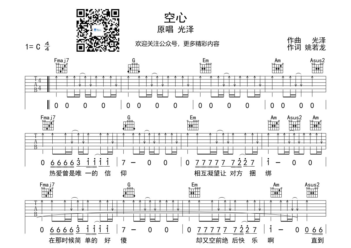 《空心》是光泽演唱的一首歌曲,本吉他谱采用的是C调指法编配,这份吉他谱共有三张高清图谱,图谱由 @梦马音乐官方 编配上传,图谱使用六线谱编配,包含吉他和弦指法、简谱以及歌词部分,曲谱配备了相关的视频提供浏览,使用这份空心吉他谱,可以让你更加方便地掌握这首歌曲的弹唱技巧,快来尝试吧。空心吉他谱,光泽的一首歌曲,C调指法,老师要点讲解:这首歌曲整首歌都是四个和弦在不断的循环重复,很简单。节奏都是差不多的扫弦,略有变化。结尾部分因为我怕太单调,就扒了一下原曲的结尾旋律。开头部分的旋律是我自己加的,也是为了让歌曲更丰富一点。开头和结尾在谱子里没有写出来,就当我的一点保留吧。