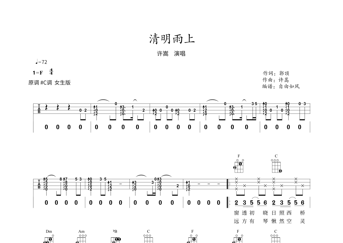 许嵩《清明雨上》尤克里里谱 - F调尤克里里谱