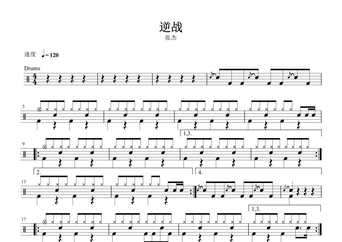 《逆战》是张杰演唱的一首歌曲,这份鼓谱共有两张高清图谱,图谱由 @打鼓谱 编配上传,图谱使用五线谱编配,使用这份逆战架子鼓谱,你将能够轻松地敲打出这首张杰的逆战,快来尝试吧。《逆战》是为腾讯游戏枪战网游“逆战”演唱的歌曲,由裴育作词,曲世聪作曲编曲,张杰演唱,收录在张杰2012年发行的专辑《One Chance 张杰新歌+精选》里,2012年3月21日在腾讯游戏2012年度发布会首唱,MV由周君执导,2012年9月3日首播 。 。