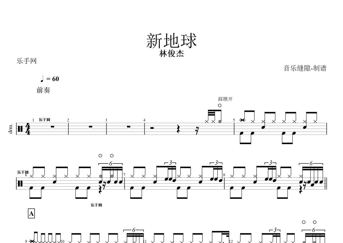 《新地球》是林俊杰演唱的一首歌曲,这份鼓谱共有三张高清图谱,图谱由 @打鼓谱 编配上传,图谱使用五线谱编配,使用这份新地球架子鼓谱,你将能够轻松地敲打出这首林俊杰的新地球,快来尝试吧。此谱出处来自乐手网分享,需要更多鼓谱定制请到乐手网。 《新地球》是林俊杰演唱的一首歌曲,由林秋离填词,林俊杰谱曲、编曲,收录在林俊杰2014年12月27日由华纳唱片发行的专辑《新地球》中,是该专辑的同名主打歌。歌曲于2015年5月获得全球流行音乐金榜的年度20大金曲奖。
