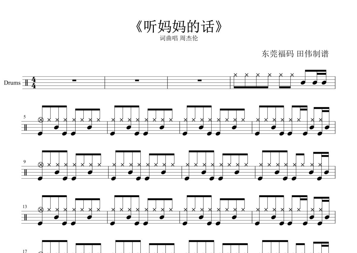 《听妈妈的话》是周杰伦演唱的一首歌曲,这份鼓谱共有两张高清图谱,图谱由 @打鼓谱 编配上传,图谱使用五线谱编配,使用这份听妈妈的话架子鼓谱,你将能够轻松地敲打出这首周杰伦的听妈妈的话,快来尝试吧。《听妈妈的话》是周杰伦演唱的一首歌曲,由周杰伦作词、作曲,林迈可、洪敬尧编曲 ,收录在周杰伦2006年9月5日发行的专辑《依然范特西》中。