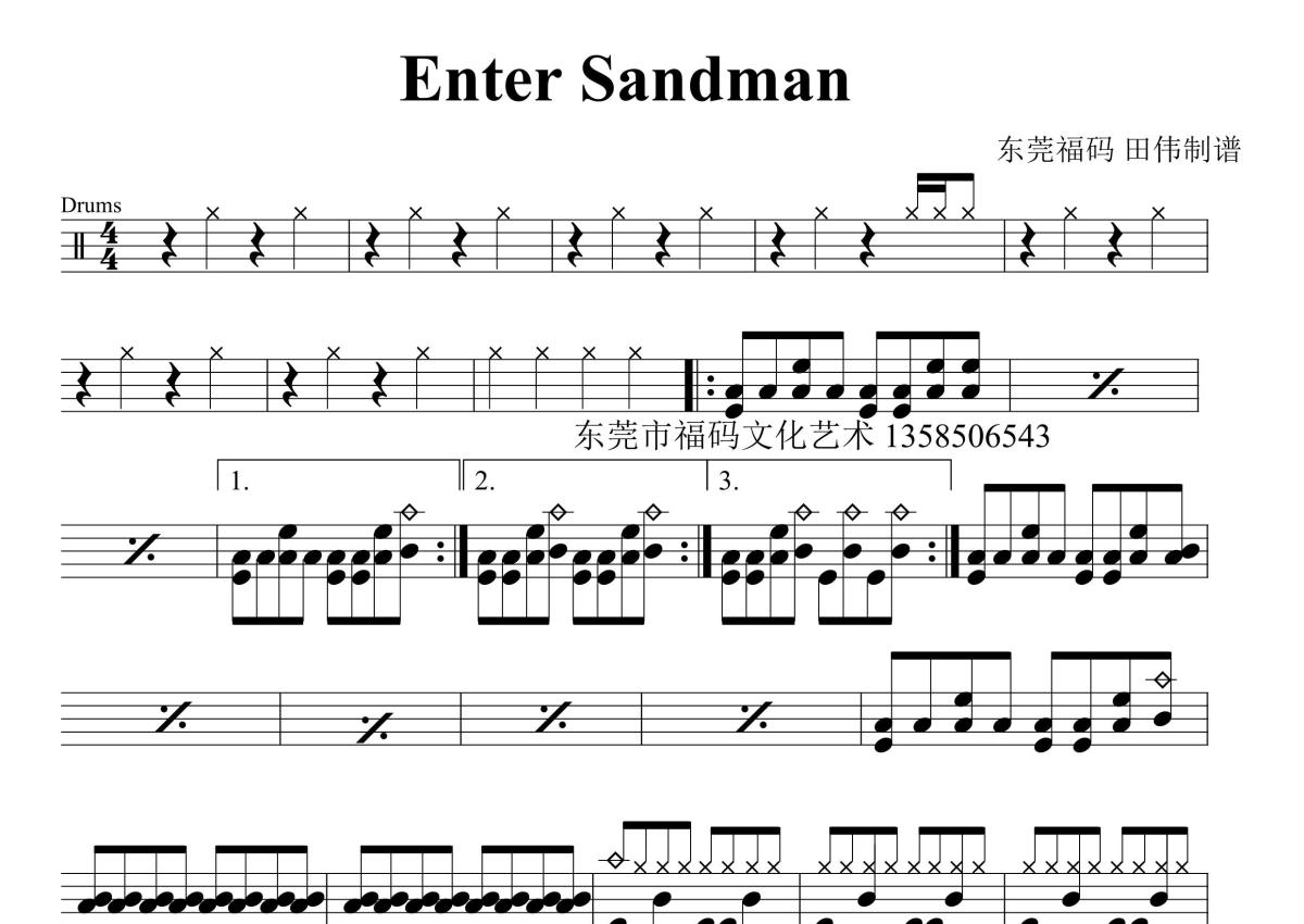 《enter sandman》是Metallica金属乐队演唱的一首歌曲,这份鼓谱共有三张高清图谱,图谱由 @打鼓谱 编配上传,图谱使用五线谱编配,使用这份enter sandman架子鼓谱,你将能够轻松地敲打出这首Metallica金属乐队的enter sandman,快来尝试吧。《Enter sandman》是METALLICA最经典的歌曲之一,其优美、深远的SOLO,被很多人评为最佳SOLO之一,获得过格莱美最佳重金属歌曲奖。这首据称是Kirk Hammett凌晨三点在一个酒店中创作的歌曲,抢耳、猛烈的riff,优美深远、曾被很多人评为最佳之一的SOLO,获得过格莱美最佳重金属歌曲奖,成为后来Metallica每一场现场必演的曲目之一。