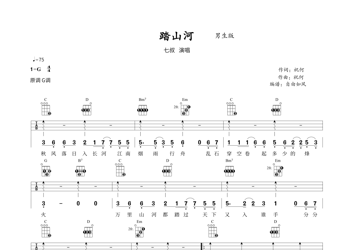 《踏山河》是七叔演唱的一首歌曲,本尤克里里谱采用的是G调指法编配,这份尤克里里谱共有两张高清图谱,图谱由 @自由如风 编配上传,图谱使用四线谱编配,包含尤克里里和弦指法、简谱以及歌词部分,曲谱配备了相关的音频提供试听,使用这份踏山河尤克里里谱,可以让你更加方便地掌握这首歌曲的弹唱技巧,快来尝试吧。男生版。