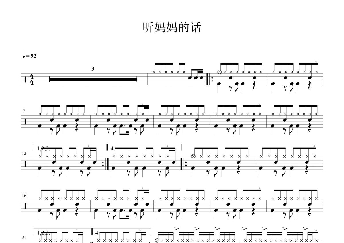 《听妈妈的话》是周杰伦演唱的一首歌曲,这份鼓谱共有一张高清图谱,图谱由 @打鼓谱 编配上传,图谱使用五线谱编配,使用这份听妈妈的话架子鼓谱,你将能够轻松地敲打出这首周杰伦的听妈妈的话,快来尝试吧。《听妈妈的话》是周杰伦演唱的一首歌曲,由周杰伦作词、作曲,林迈可、洪敬尧编曲,收录在周杰伦2006年9月5日发行的专辑《依然范特西》中。 2006年,因其歌词传递了正能量,有潜移默化的教育意义,入选台北教育大学附属实验国民小学一年级教材。