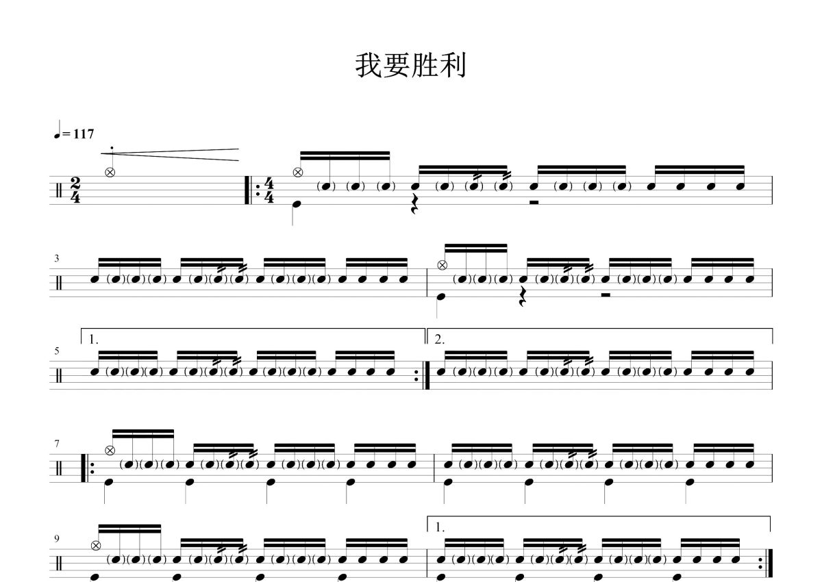 《我要胜利》是周澎演唱的一首歌曲,这份鼓谱共有三张高清图谱,图谱由 @打鼓谱 编配上传,图谱使用五线谱编配,使用这份我要胜利架子鼓谱,你将能够轻松地敲打出这首周澎的我要胜利,快来尝试吧。《我要胜利》是中国内地男歌手周澎演唱的歌曲,于2015年12月发行。