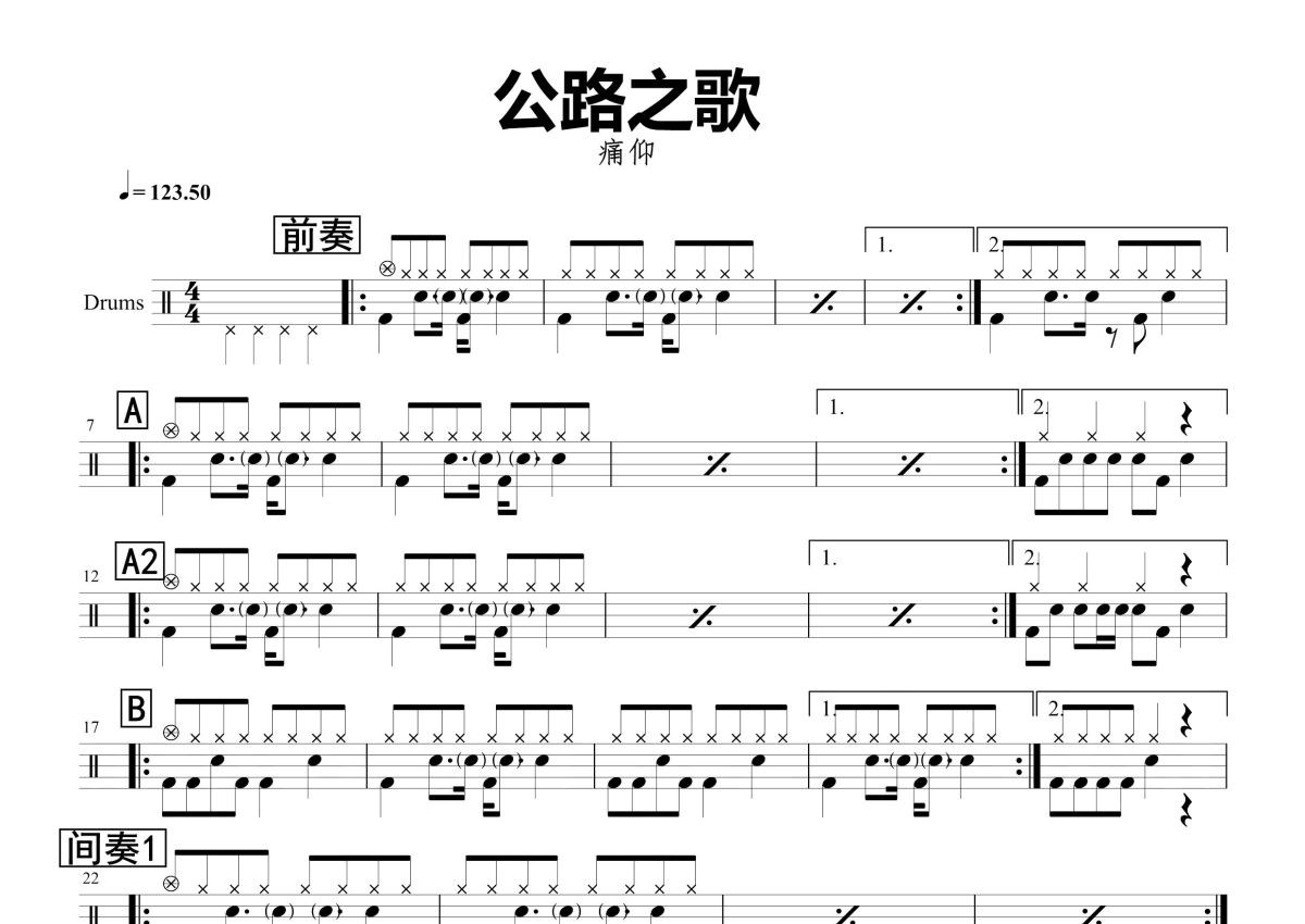 《公路之歌》是痛仰演唱的一首歌曲,这份鼓谱共有一张高清图谱,图谱由 @打鼓谱 编配上传,图谱使用五线谱编配,使用这份公路之歌架子鼓谱,你将能够轻松地敲打出这首痛仰的公路之歌,快来尝试吧。《公路之歌》是痛苦的信仰乐队的一首知名歌曲,在奋斗的道路上一直在拜读。一样的积极,多了些温暖。看起来,想必是痛仰在游历云南、西藏、尼泊尔乃至新藏铁路之后真实的心底写照。摇滚的精髓在于真实,没有真正经历过怎会给听者如此真实的感应。“梦想在什么地方?总是那么令人向往。”这是所有所谓“摇滚青年”“文艺青年”“文学青年”“新青年”的共同心声。