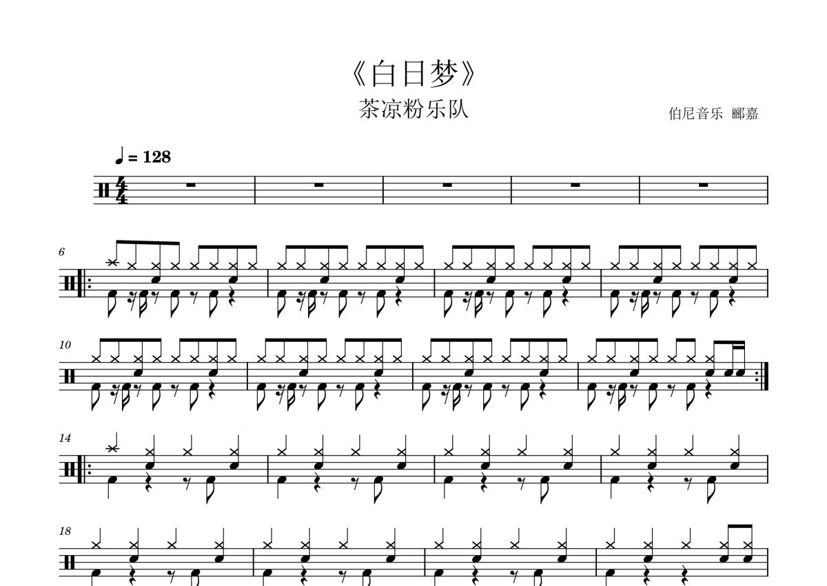 《白日梦》是茶凉粉乐队演唱的一首歌曲,这份鼓谱共有三张高清图谱,图谱由 @打鼓谱 编配上传,图谱使用五线谱编配,使用这份白日梦架子鼓谱,你将能够轻松地敲打出这首茶凉粉乐队的白日梦,快来尝试吧。打了几遍重新编辑了一下。