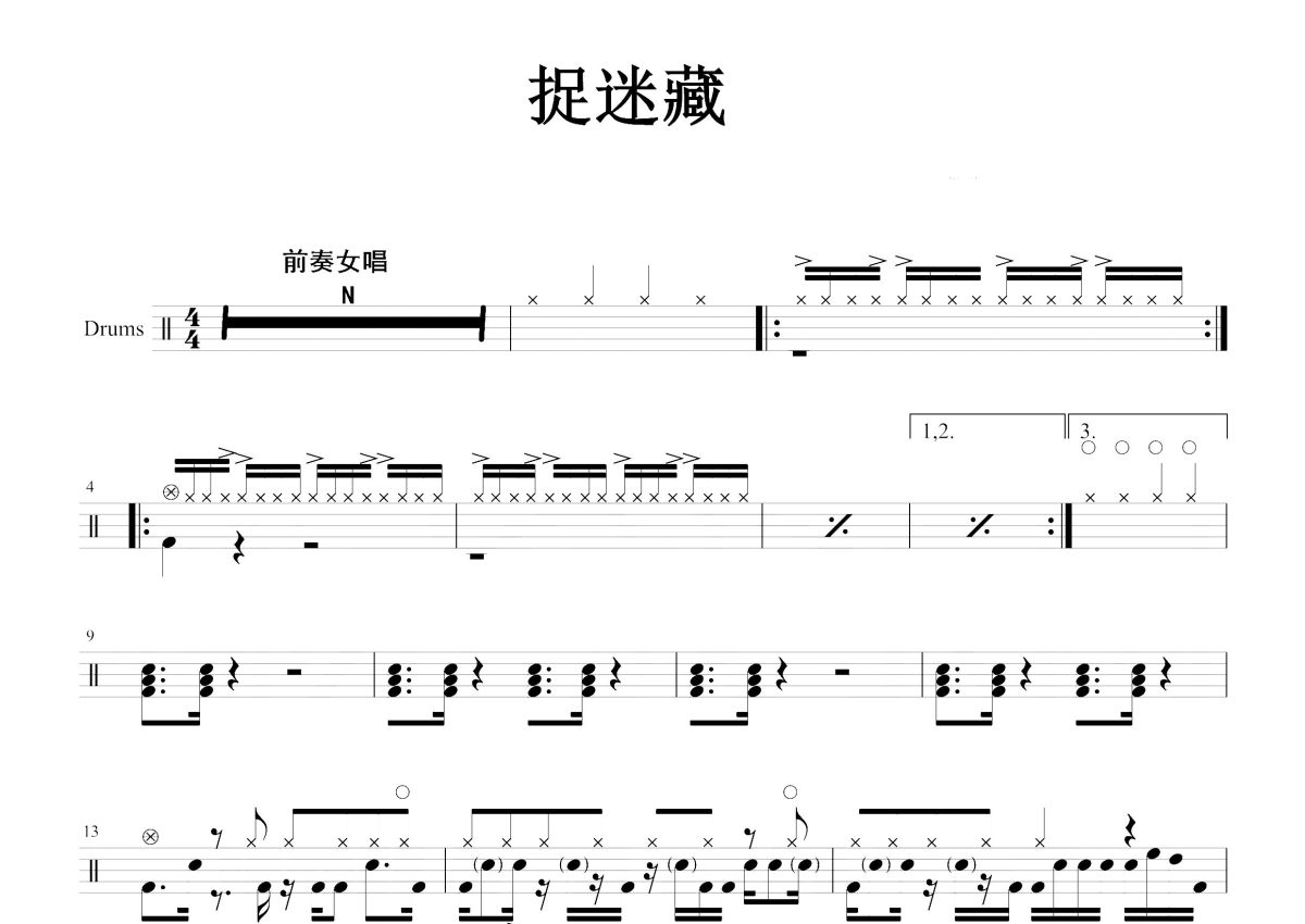 《捉迷藏》是张学友演唱的一首歌曲,这份鼓谱共有四张高清图谱,图谱由 @打鼓谱 编配上传,图谱使用五线谱编配,使用这份捉迷藏架子鼓谱,你将能够轻松地敲打出这首张学友的捉迷藏,快来尝试吧。《捉迷藏》由张学友作曲、演唱的歌曲,林夕填词,欧丁玉编曲,于2000年12月1日发行。