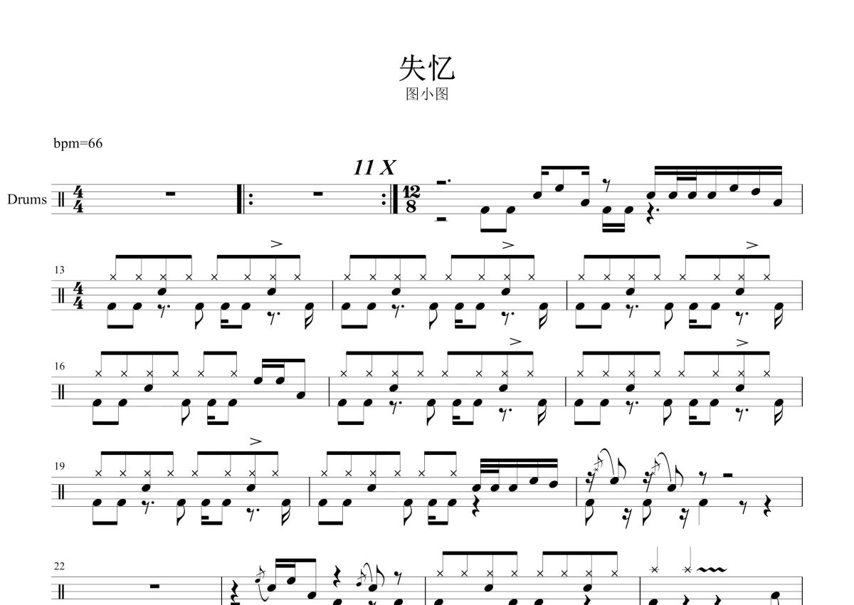 《失忆》是图小图演唱的一首歌曲,这份鼓谱共有两张高清图谱,图谱由 @打鼓谱 编配上传,图谱使用五线谱编配,使用这份失忆架子鼓谱,你将能够轻松地敲打出这首图小图的失忆,快来尝试吧。《失忆》是陈轼辛作词,刘凯作曲,由图小图演唱的一首单曲,发行于2017年11月1日。