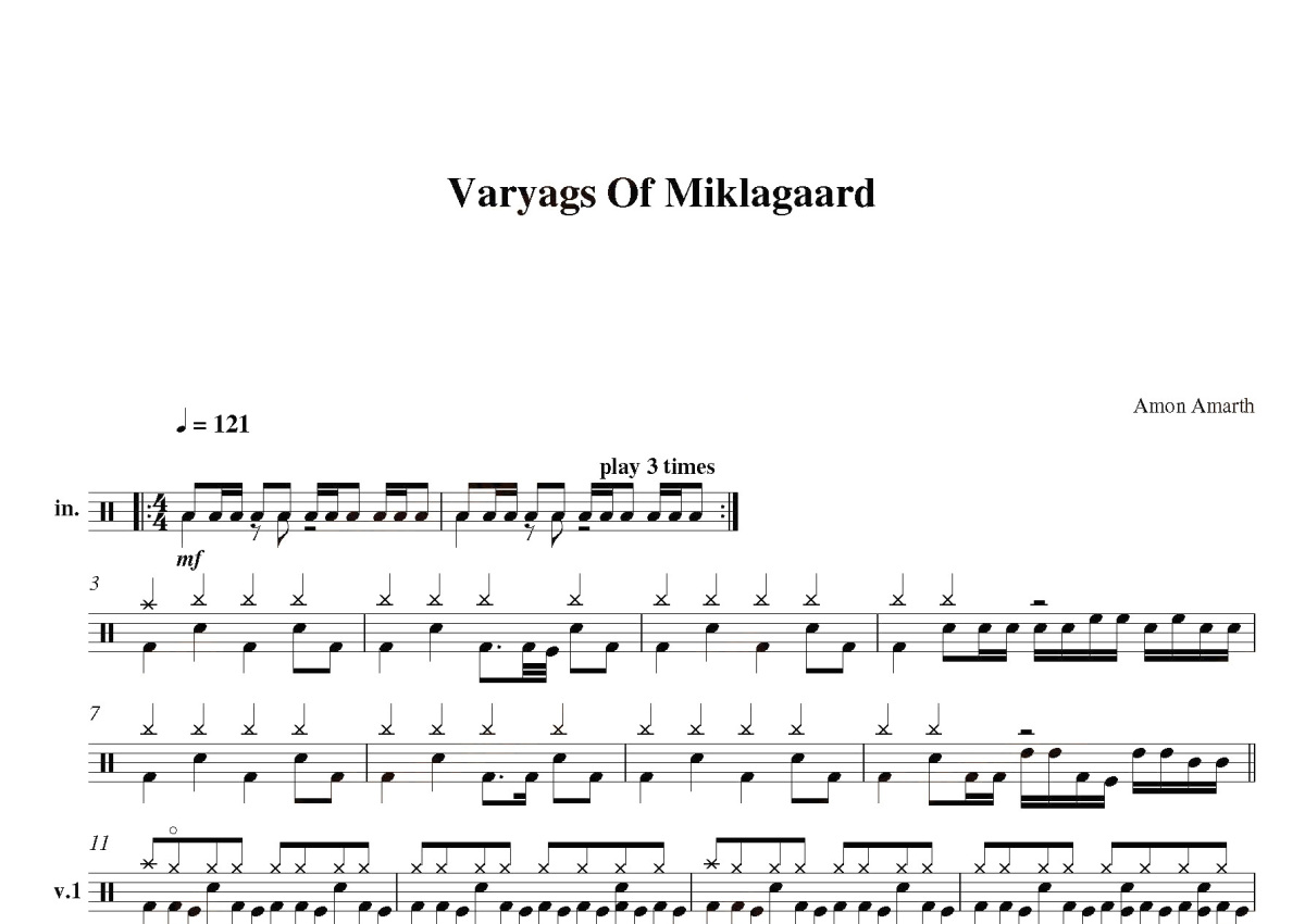 《Varyags Of Miklagaard》是Amon Amarth演唱的一首歌曲,这份鼓谱共有两张高清图谱,图谱由 @打鼓谱 编配上传,图谱使用五线谱编配,使用这份Varyags Of Miklagaard架子鼓谱,你将能够轻松地敲打出这首Amon Amarth的Varyags Of Miklagaard,快来尝试吧。歌 曲Varyags Of Miklagaard 发行日期2008-09-30 歌手 Amon Amarth 所属专辑Twilight Of The Thunder God。