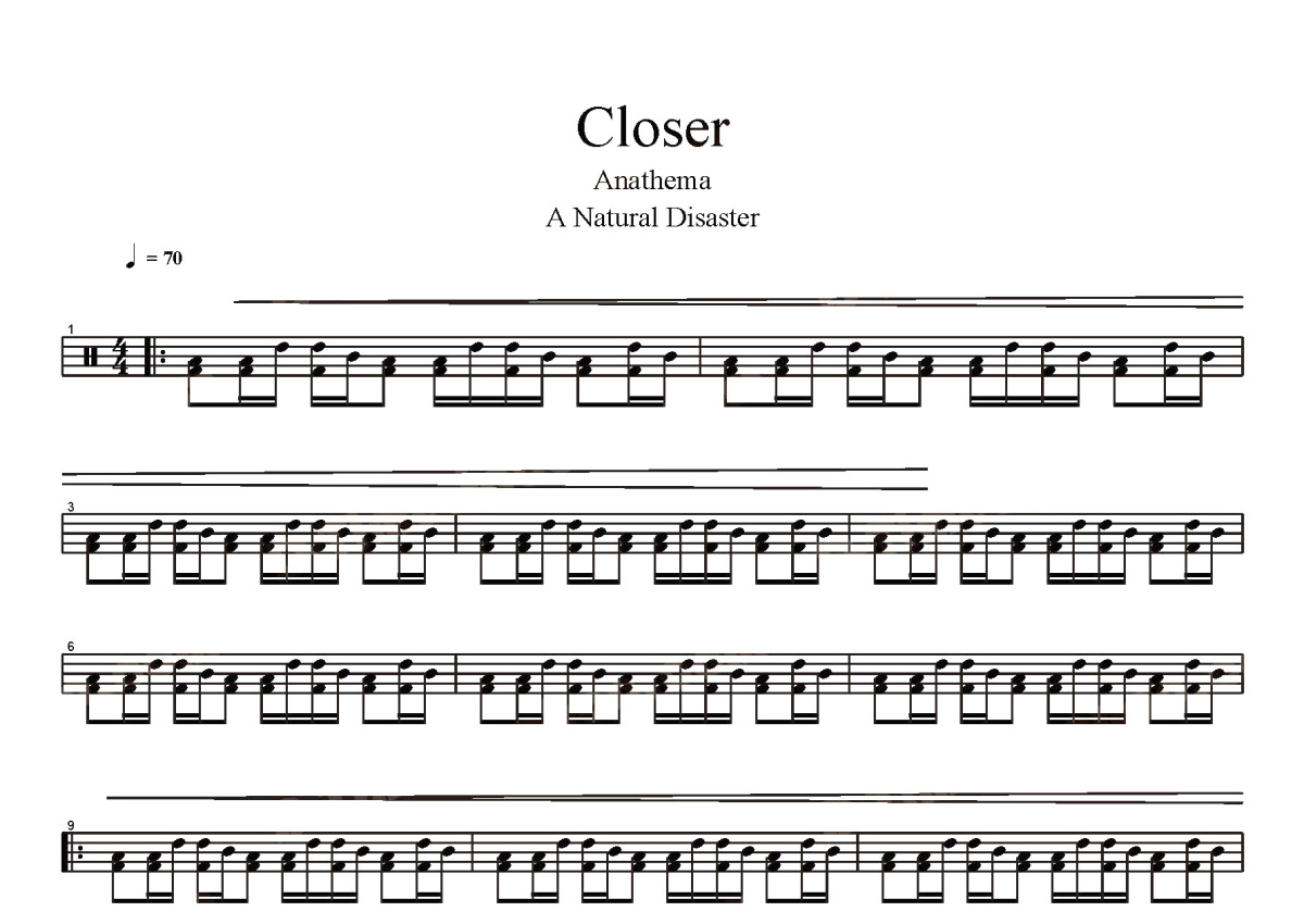 《Closer》是Anathema演唱的一首歌曲,这份鼓谱共有三张高清图谱,图谱由 @打鼓谱 编配上传,图谱使用五线谱编配,使用这份Closer架子鼓谱,你将能够轻松地敲打出这首Anathema的Closer,快来尝试吧。《Closer》是由美国电子音乐组合烟鬼组合制作,其成员安德鲁·塔格特以及女歌手海尔希共同演唱的歌曲,由安德鲁·塔格特、肖恩·弗兰克和弗雷德里克·肯尼特等创作,于2016年7月29日通过Disruptor唱片和哥伦比亚唱片发行 [1] ,后收录在烟鬼组合2016年11月4日由索尼音乐发行的EP《Collage》中。