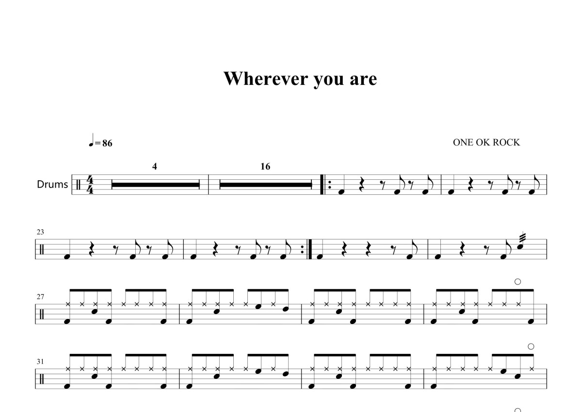 《Wherever you are》是ONE OK ROCK (ワンオクロック)演唱的一首歌曲,这份鼓谱共有三张高清图谱,图谱由 @打鼓谱 编配上传,图谱使用五线谱编配,使用这份Wherever you are架子鼓谱,你将能够轻松地敲打出这首ONE OK ROCK (ワンオクロック)的Wherever you are,快来尝试吧。 ONE OK ROCK(ワンオクロック)是一支日本摇滚乐队,于2005年成立,2007年正式出道。凭借扎实的音乐功底,前沿的曲风和热血激昂的现场表现力已稳固发展成为地位超群的实力团体,并受到全球范围内的粉丝追捧。