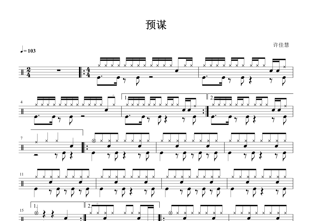 《预谋》是许佳慧演唱的一首歌曲,拍号为4/4拍,歌曲速度为每分钟103拍,这份鼓谱共有两张高清图谱,图谱由 @打鼓谱 编配上传,图谱使用五线谱编配,使用这份预谋架子鼓谱,你将能够轻松地敲打出这首许佳慧的预谋,快来尝试吧。《预谋》是许佳慧演唱的一首歌曲,由代理仁填词谱曲、金泽编曲。收录在许佳慧2012年1月4日发行的专辑《一拍两散》中的一首歌曲。