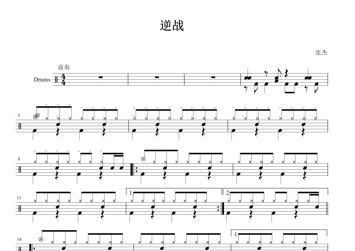 《逆战》是张杰演唱的一首歌曲,这份鼓谱共有三张高清图谱,图谱由 @打鼓谱 编配上传,图谱使用五线谱编配,使用这份逆战架子鼓谱,你将能够轻松地敲打出这首张杰的逆战,快来尝试吧。《逆战》是为腾讯游戏枪战网游“逆战”演唱的歌曲,由裴育作词,曲世聪作曲编曲,张杰演唱,收录在张杰2012年发行的专辑《One Chance 张杰新歌+精选》里,2012年3月21日在腾讯游戏2012年度发布会首唱。