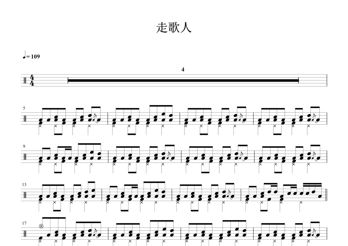 《走歌人》是暗杠演唱的一首歌曲,这份鼓谱共有四张高清图谱,图谱由 @打鼓谱 编配上传,图谱使用五线谱编配,使用这份走歌人架子鼓谱,你将能够轻松地敲打出这首暗杠的走歌人,快来尝试吧。《走歌人》是独立音乐人暗杠的原创音乐作品。所属于音乐专辑《一念》中。与2016年6月28日发布,由肆格张、暗杠、李思迁填词。
