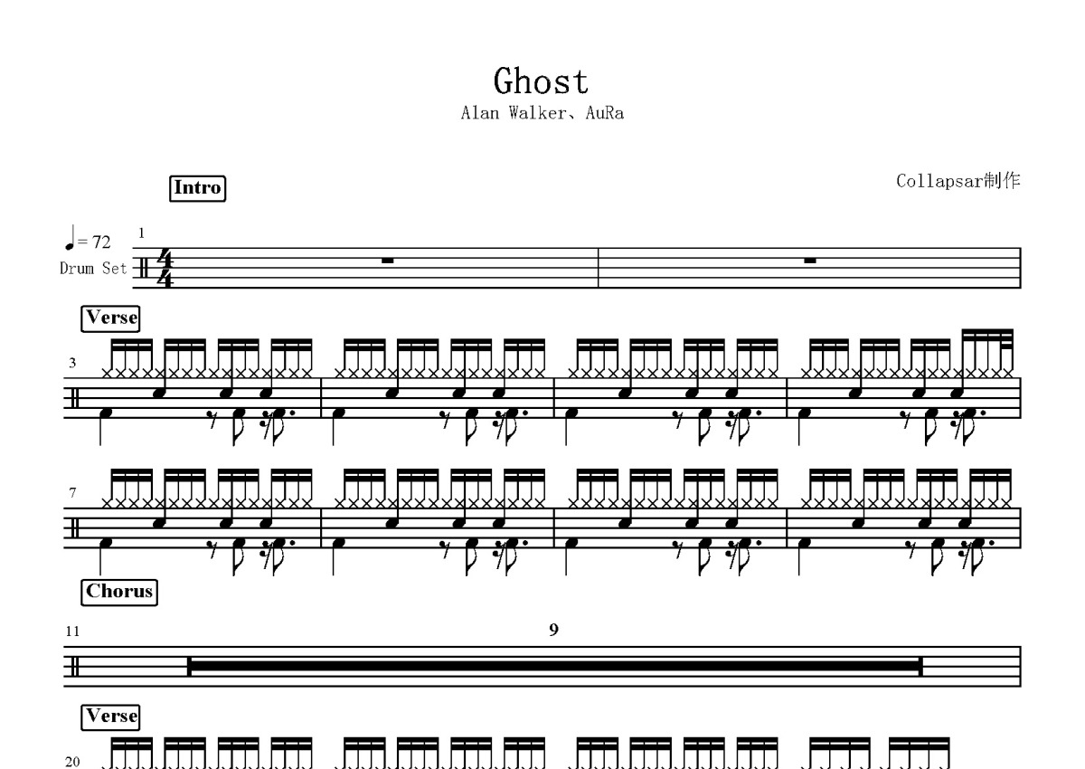 Au/Ra/Alan Walker《Ghost》鼓谱 - 架子鼓谱