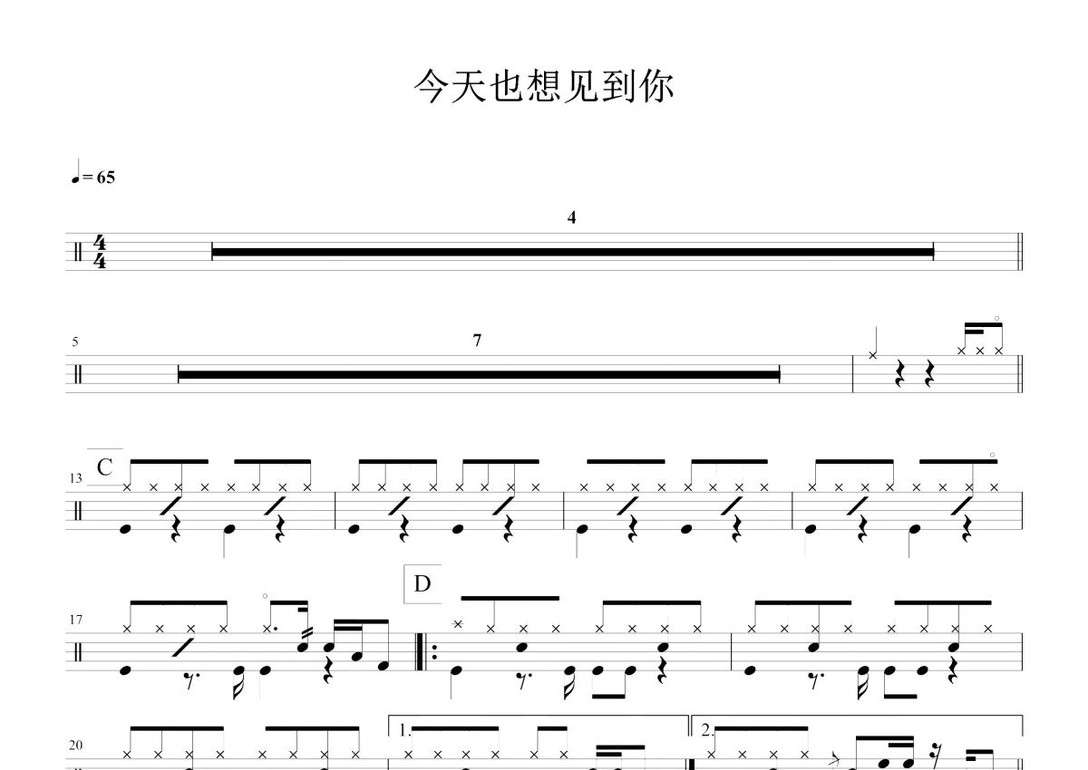 《今天也想见到你》是焦迈奇演唱的一首歌曲,这份鼓谱共有两张高清图谱,图谱由 @打鼓谱 编配上传,图谱使用五线谱编配,使用这份今天也想见到你架子鼓谱,你将能够轻松地敲打出这首焦迈奇的今天也想见到你,快来尝试吧。《今天也想见到你》是由秦昊作词作曲、焦迈奇演唱的歌曲,收录于2019年4月24日发行的专辑《我的名字》中。