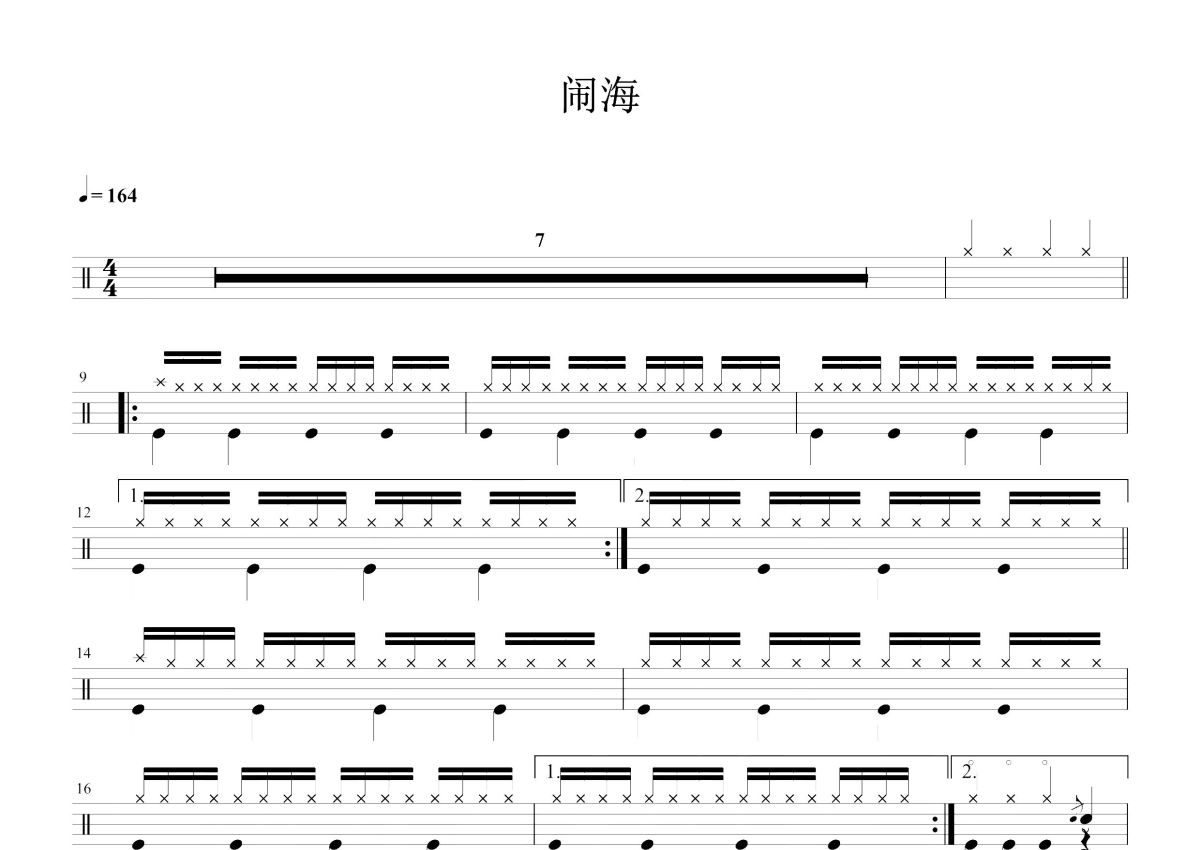 《闹海》是哪吒乐队演唱的一首歌曲,这份鼓谱共有四张高清图谱,图谱由 @打鼓谱 编配上传,图谱使用五线谱编配,使用这份闹海架子鼓谱,你将能够轻松地敲打出这首哪吒乐队的闹海,快来尝试吧。收录于哪吒乐队在2012年12月22日发行的专辑《他在时间门外》中。 哪吒只哭过一次,从今后不会再有。。