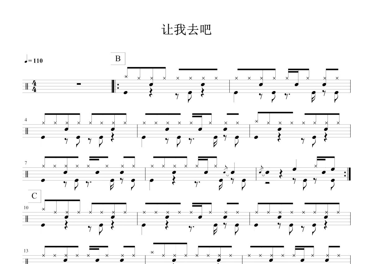《让我去吧》是破碎乐队演唱的一首歌曲,这份鼓谱共有三张高清图谱,图谱由 @打鼓谱 编配上传,图谱使用五线谱编配,使用这份让我去吧架子鼓谱,你将能够轻松地敲打出这首破碎乐队的让我去吧,快来尝试吧。《让我去吧》是破碎乐队演唱的一首歌曲,所属专辑为《破碎声音》。