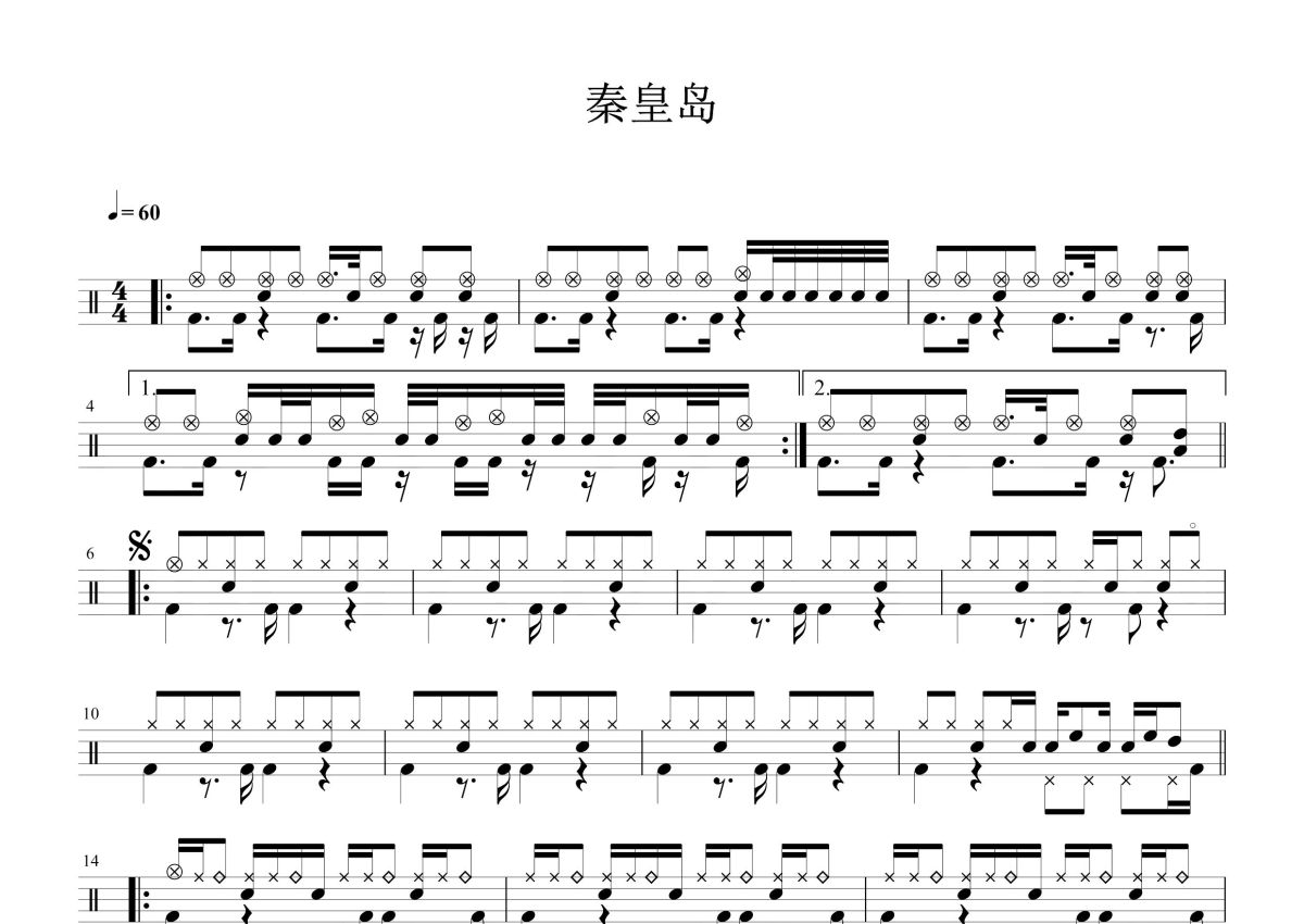 《秦皇岛》是万能青年旅店演唱的一首歌曲,这份鼓谱共有两张高清图谱,图谱由 @打鼓谱 编配上传,图谱使用五线谱编配,使用这份秦皇岛架子鼓谱,你将能够轻松地敲打出这首万能青年旅店的秦皇岛,快来尝试吧。《秦皇岛》独立摇滚乐队万能青年旅店演唱的歌曲,被收录在专辑「废人们 都在忙什么?」以及乐队同名专辑「万能青年旅店」中。
