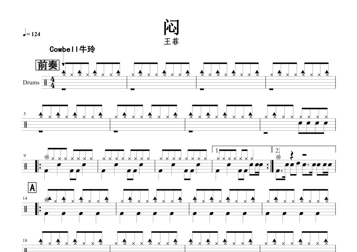 《闷》是王菲演唱的一首歌曲,这份鼓谱共有三张高清图谱,图谱由 @打鼓谱 编配上传,图谱使用五线谱编配,使用这份闷架子鼓谱,你将能够轻松地敲打出这首王菲的闷,快来尝试吧。王菲(Faye Wong),1969年8月8日出生于北京,中国流行乐女歌手、影视演员.。