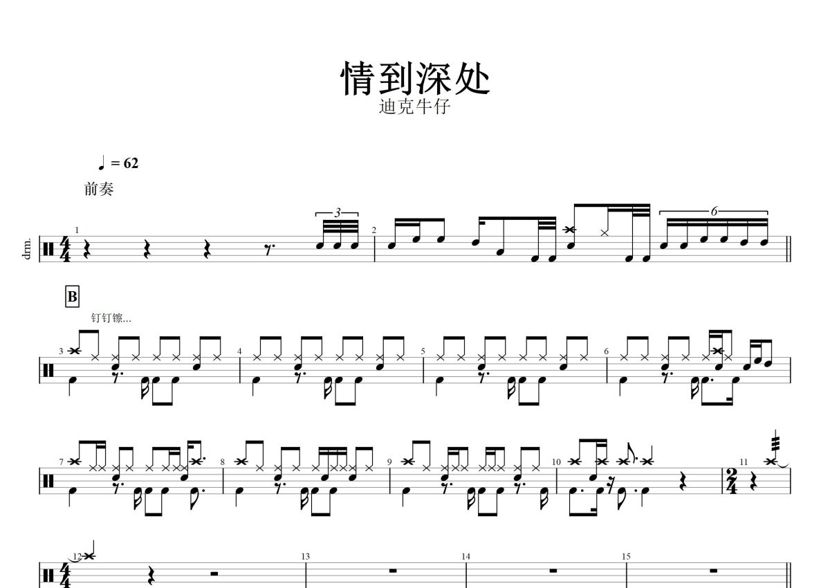 《情到深处》是迪克牛仔演唱的一首歌曲,这份鼓谱共有两张高清图谱,图谱由 @打鼓谱 编配上传,图谱使用五线谱编配,使用这份情到深处架子鼓谱,你将能够轻松地敲打出这首迪克牛仔的情到深处,快来尝试吧。 虽然迪克牛仔是翻唱出名的,但这首《情到深处》还真的是迪克牛仔首唱的,也可以说是原唱了,词曲作者都是黄凯!。