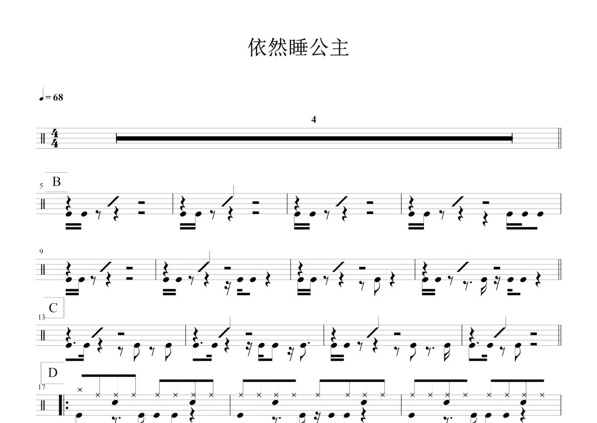 《依然睡公主》是邓紫棋演唱的一首歌曲,这份鼓谱共有两张高清图谱,图谱由 @打鼓谱 编配上传,图谱使用五线谱编配,使用这份依然睡公主架子鼓谱,你将能够轻松地敲打出这首邓紫棋的依然睡公主,快来尝试吧。《依然睡公主》是由邓紫棋创作词曲并演唱的歌曲,收录于邓紫棋2019年发行的音乐专辑《摩天动物园》中。