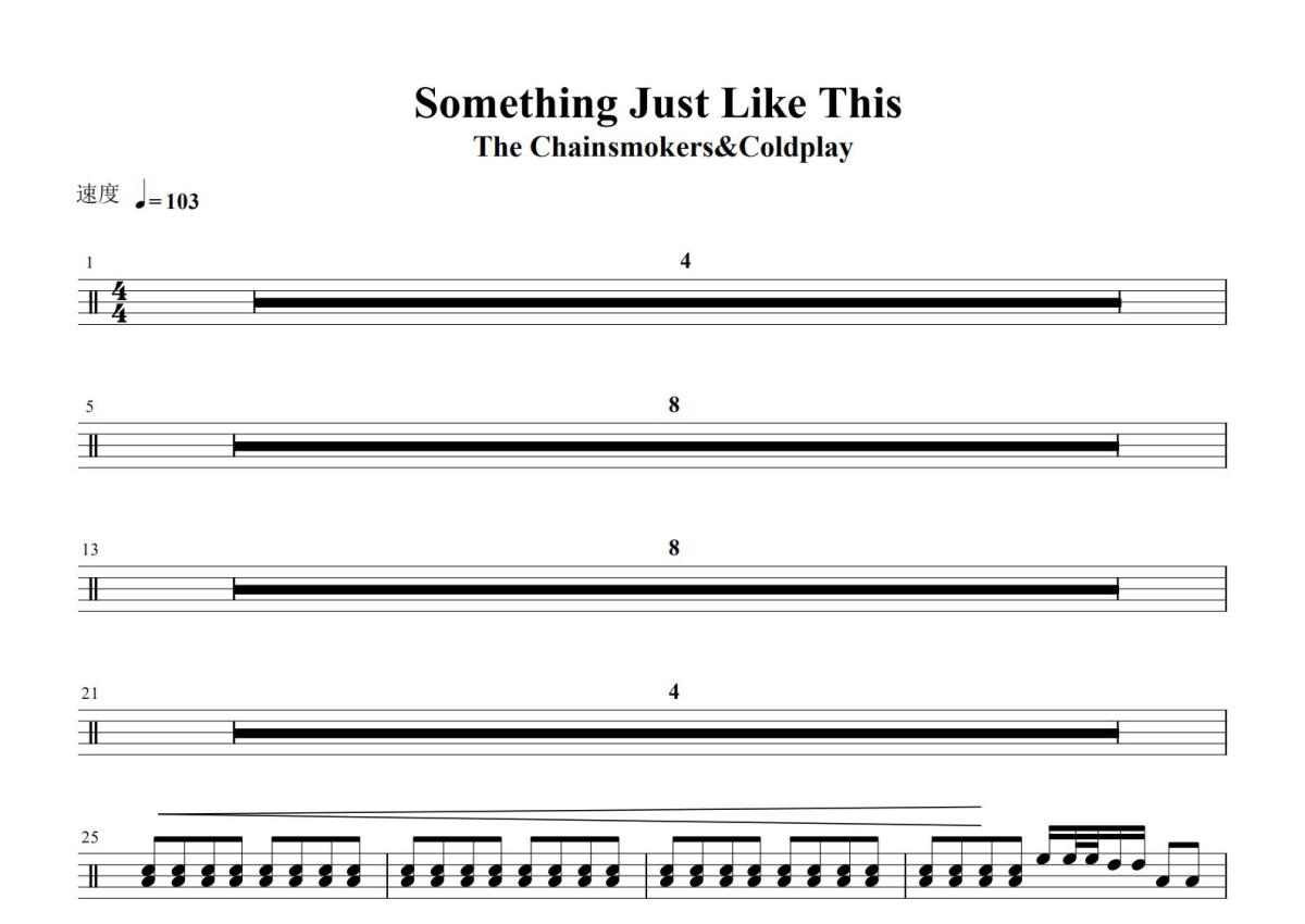 《Something Just Like This》是烟鬼组合、酷玩乐队演唱的一首歌曲,这份鼓谱共有三张高清图谱,图谱由 @打鼓谱 编配上传,图谱使用五线谱编配,使用这份Something Just Like This架子鼓谱,你将能够轻松地敲打出这首烟鬼组合、酷玩乐队的Something Just Like This,快来尝试吧。《Something Just Like This》是烟鬼组合、酷玩乐队合作的歌曲,词曲由安德鲁·塔格特、克里斯·马汀、Guy Berryman、Jonny Buckland和威尔·查平共同创作,主音由酷玩乐队主唱克里斯·马汀担任。该曲在2017年2月22日以单曲形式发行,后收录在烟鬼组合的首张录音室专辑《Memories...Do Not Open》和酷玩乐队的迷你专辑《Kaleidoscope》中。