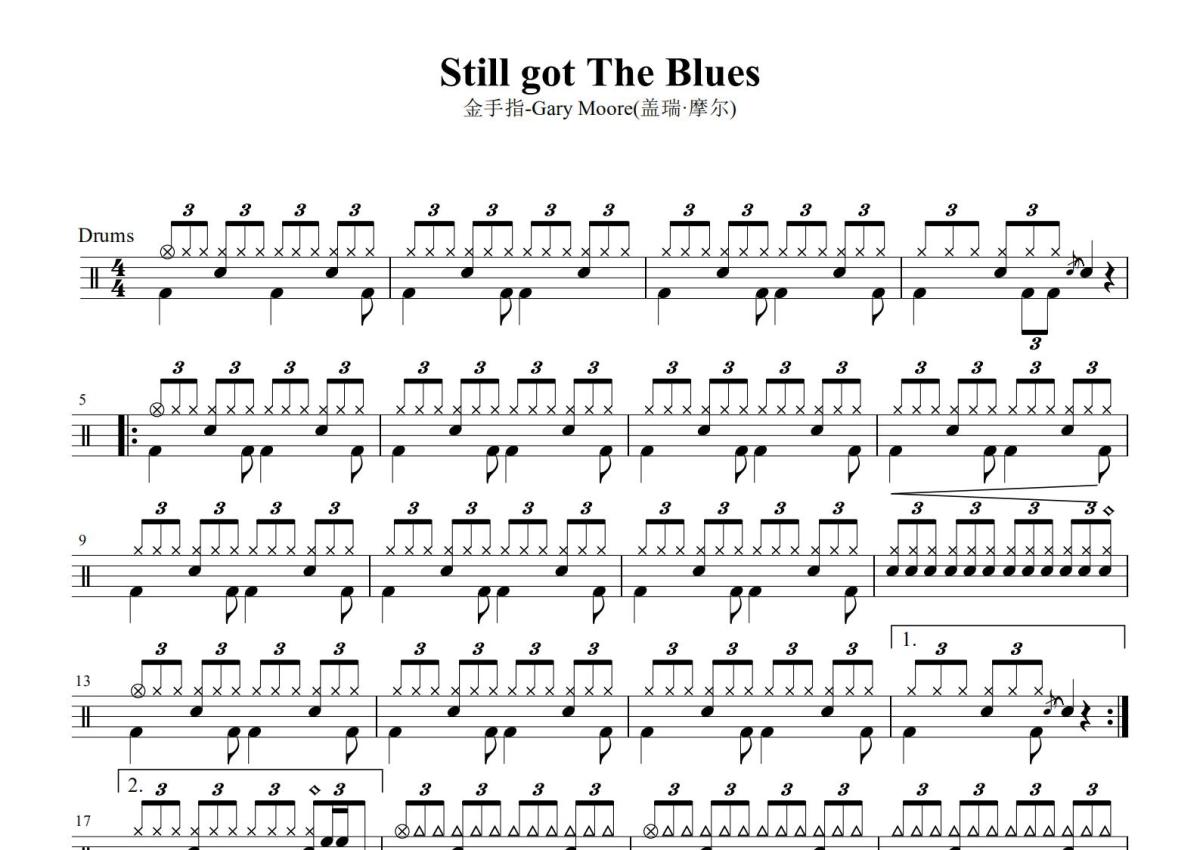 《still》是盖瑞摩尔演唱的一首歌曲,这份鼓谱共有两张高清图谱,图谱由 @打鼓谱 编配上传,图谱使用五线谱编配,使用这份still架子鼓谱,你将能够轻松地敲打出这首盖瑞摩尔的still,快来尝试吧。《still》是由金手指吉他手盖瑞摩尔的一首歌。