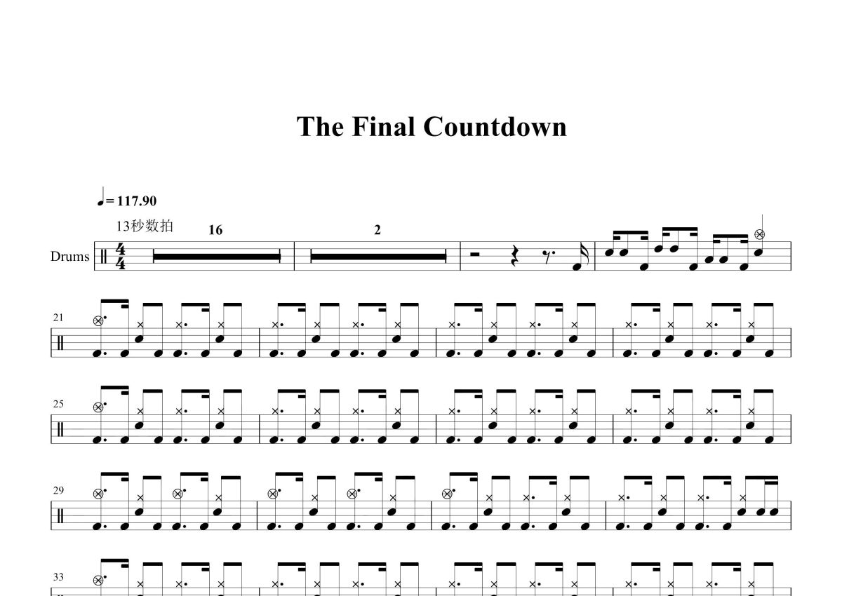 《The Final Countdown》是Europe乐队演唱的一首歌曲,这份鼓谱共有四张高清图谱,图谱由 @打鼓谱 编配上传,图谱使用五线谱编配,使用这份The Final Countdown架子鼓谱,你将能够轻松地敲打出这首Europe乐队的The Final Countdown,快来尝试吧。《the final countdown(最后倒计时,最后倒数)》是1986年2月14日发行,Europe乐队创作并演唱的一首瑞典歌曲。 听到这首歌就想到赌神。