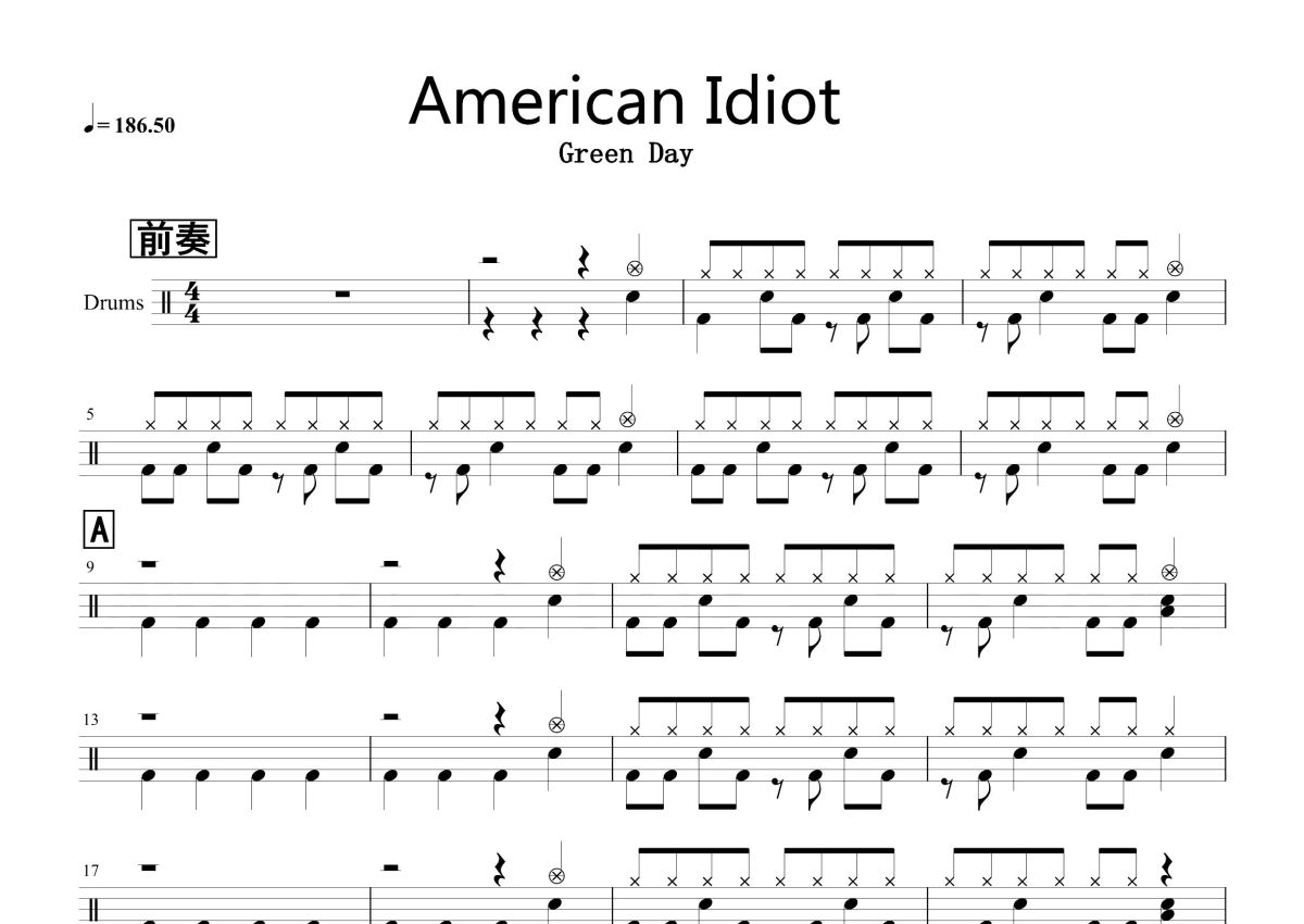 《American Idiot》是Green Day演唱的一首歌曲,这份鼓谱共有四张高清图谱,图谱由 @打鼓谱 编配上传,图谱使用五线谱编配,使用这份American Idiot架子鼓谱,你将能够轻松地敲打出这首Green Day的American Idiot,快来尝试吧。《American Idiot》是美国朋克乐队绿日的第七张录音室专辑,于2004年9月21日由Reprise唱片公司发行,共收录13首歌曲,制作人包括罗伯·卡瓦罗和绿日。