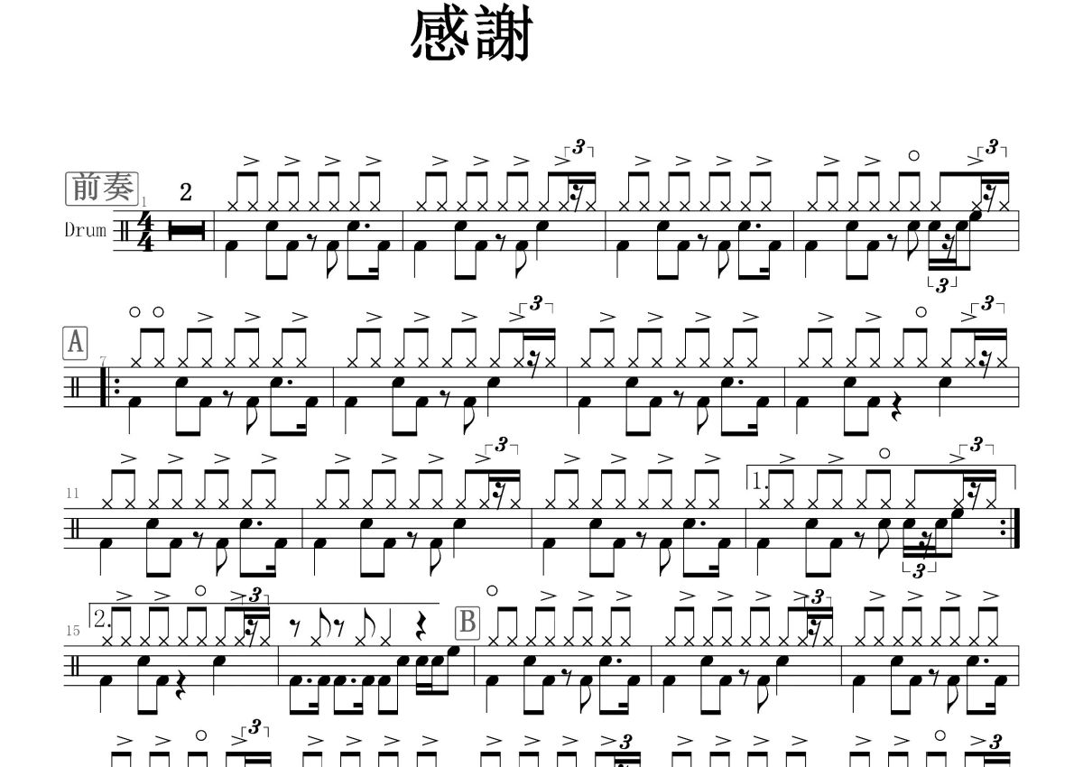 《感谢》是RSP演唱的一首歌曲,这份鼓谱共有两张高清图谱,图谱由 @打鼓谱 编配上传,图谱使用五线谱编配,使用这份感谢架子鼓谱,你将能够轻松地敲打出这首RSP的感谢,快来尝试吧。收录于2008年02月06日发行的专辑《感谢》中 。