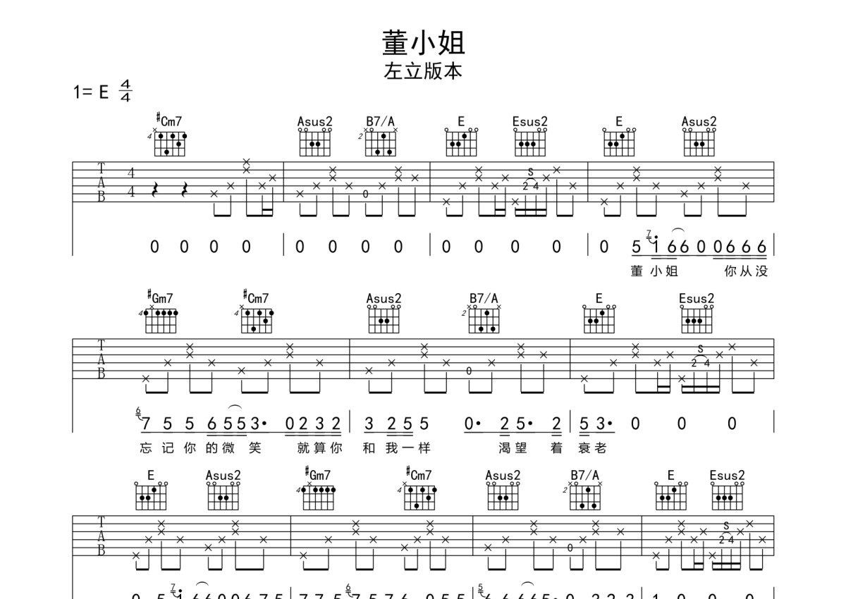 左立《董小姐》吉他谱 - E调弹唱六线谱 - 左立版本
