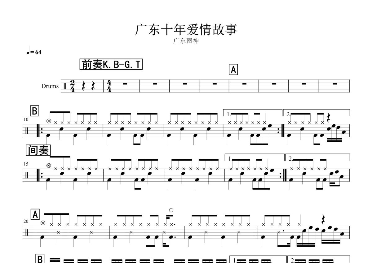 广东雨神《广东爱情故事》鼓谱 - 架子鼓谱