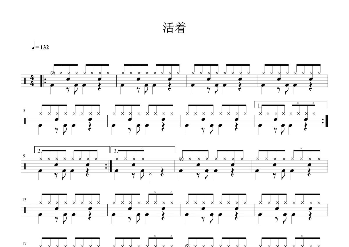 《活着》是郝云演唱的一首歌曲,这份鼓谱共有三张高清图谱,图谱由 @打鼓谱 编配上传,图谱使用五线谱编配,使用这份活着架子鼓谱,你将能够轻松地敲打出这首郝云的活着,快来尝试吧。《活着》是由郝云填词、谱曲、演唱,于2013年09月12日发行的一首城市民谣歌曲,出自郝云第三张同名专辑《活着》。郝云凭借这首歌获得2013年MusicRadio中国TOP排行榜最佳创作男歌手,2015年第十四届音乐风云榜年度盛典最佳摇滚艺人提名。