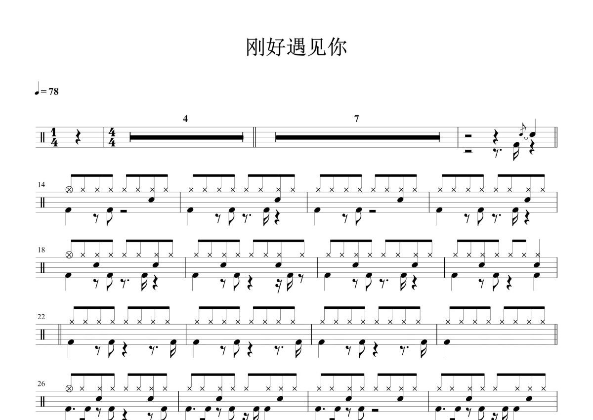 《刚好遇见你》是李玉刚演唱的一首歌曲,这份鼓谱共有一张高清图谱,图谱由 @打鼓谱 编配上传,图谱使用五线谱编配,使用这份刚好遇见你架子鼓谱,你将能够轻松地敲打出这首李玉刚的刚好遇见你,快来尝试吧。《刚好遇见你》是由高进作词、作曲,李玉刚演唱的歌曲,收录于李玉刚2017年4月6日发行的专辑《刚好遇见你》中。2016年11月19日,该曲获得全球中文音乐榜上榜周冠军。