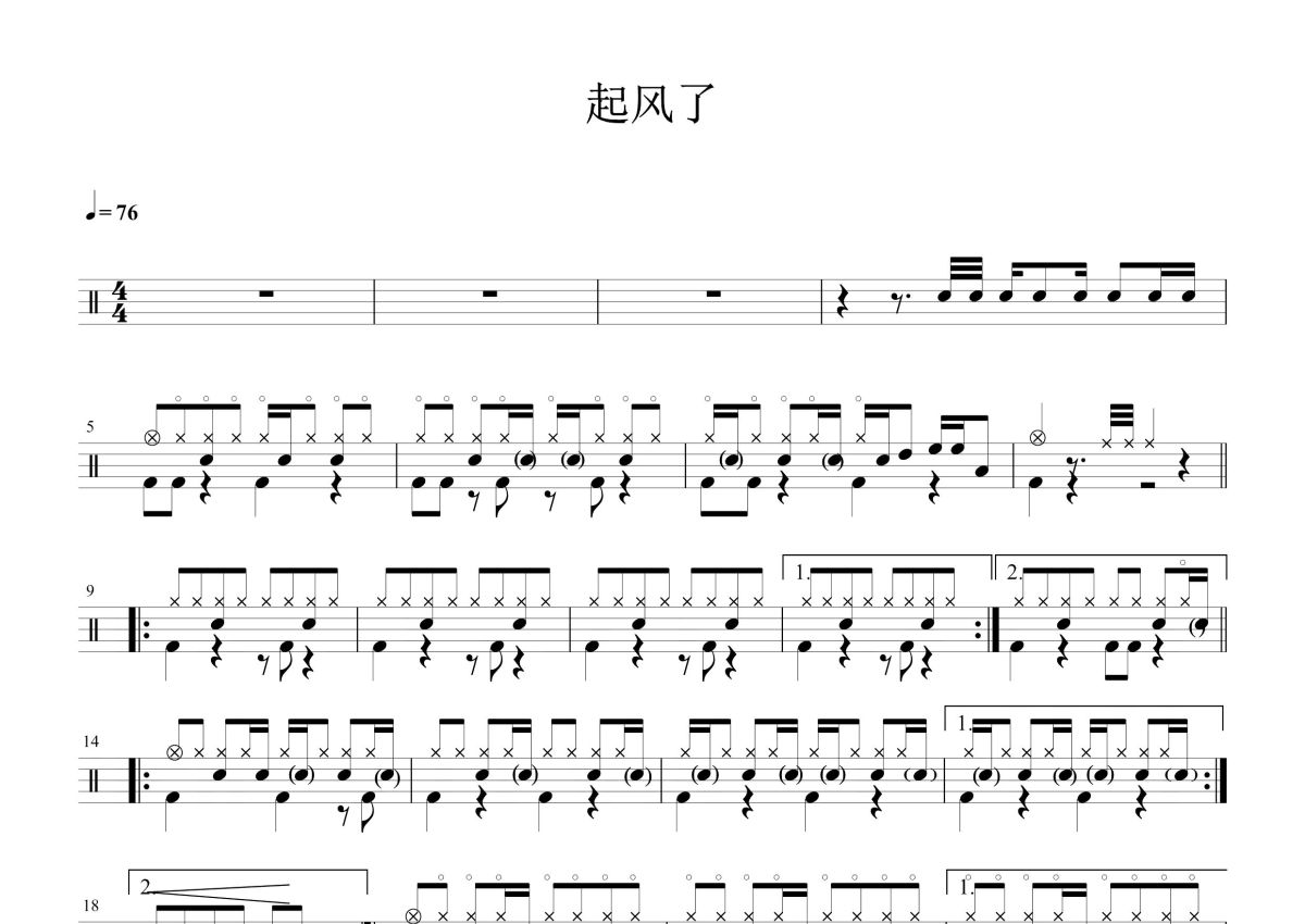 《起风了》是买辣椒也用券演唱的一首歌曲,这份鼓谱共有两张高清图谱,图谱由 @打鼓谱 编配上传,图谱使用五线谱编配,使用这份起风了架子鼓谱,你将能够轻松地敲打出这首买辣椒也用券的起风了,快来尝试吧。《起风了》是由高桥优作曲、米果作词、买辣椒也用券演唱的歌曲,于2017年2月22日以单曲的形式发行,后因未获版权问题而下架,于2018年12月3日重新发行。2019年10月31日,由吴青峰演绎的版本获得2019亚洲新歌榜港澳台年榜金曲奖。