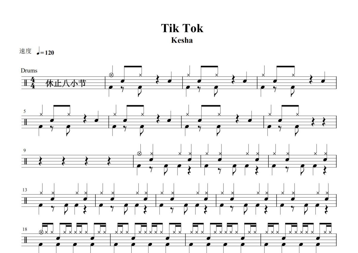 《TIK TOK》是凯莎演唱的一首歌曲,这份鼓谱共有两张高清图谱,图谱由 @打鼓谱 编配上传,图谱使用五线谱编配,使用这份TIK TOK架子鼓谱,你将能够轻松地敲打出这首凯莎的TIK TOK,快来尝试吧。《TiK ToK》是美国女歌手凯莎演唱的一首歌曲,歌曲的歌词和曲谱由凯莎、Dr.Luke和本杰明·莱文编写,Dr.Luke、本杰明·莱文制作 [1] 。歌曲收录于凯莎的首张录音室专辑《Animal》中,并作为推广专辑的首支单曲于2009年8月7日通过美国广播唱片公司发行 [2] 。