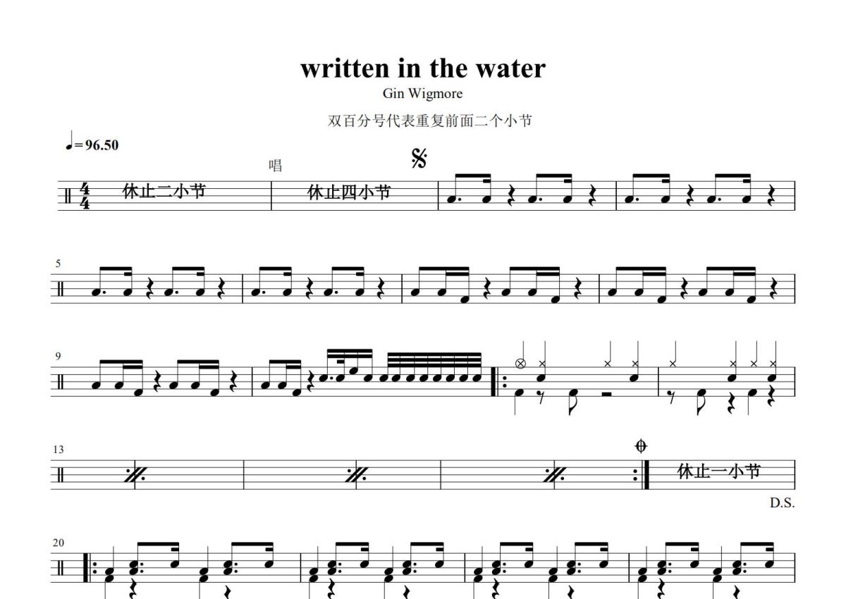《written in the water》是Gin Wigmore演唱的一首歌曲,这份鼓谱共有一张高清图谱,图谱由 @打鼓谱 编配上传,图谱使用五线谱编配,使用这份written in the water架子鼓谱,你将能够轻松地敲打出这首Gin Wigmore的written in the water,快来尝试吧。《written in the water》Gin Wigmore 出生于1986年6月6日,是一位来自新西兰的唱作歌手。Gin的声音特别与众不同,有文字没法描述的魅力。合妩媚妖娆、刚毅坚韧于一体,有一种奇特的意味。