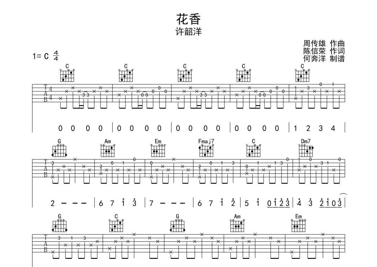 周传雄《花香》吉他谱 - C调弹唱六线谱