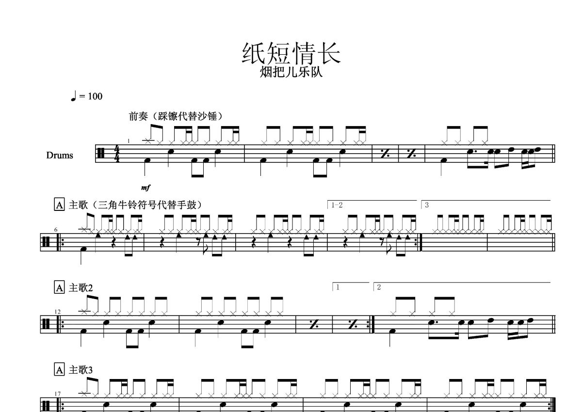 烟把儿乐队《纸短情长》鼓谱 - 架子鼓谱
