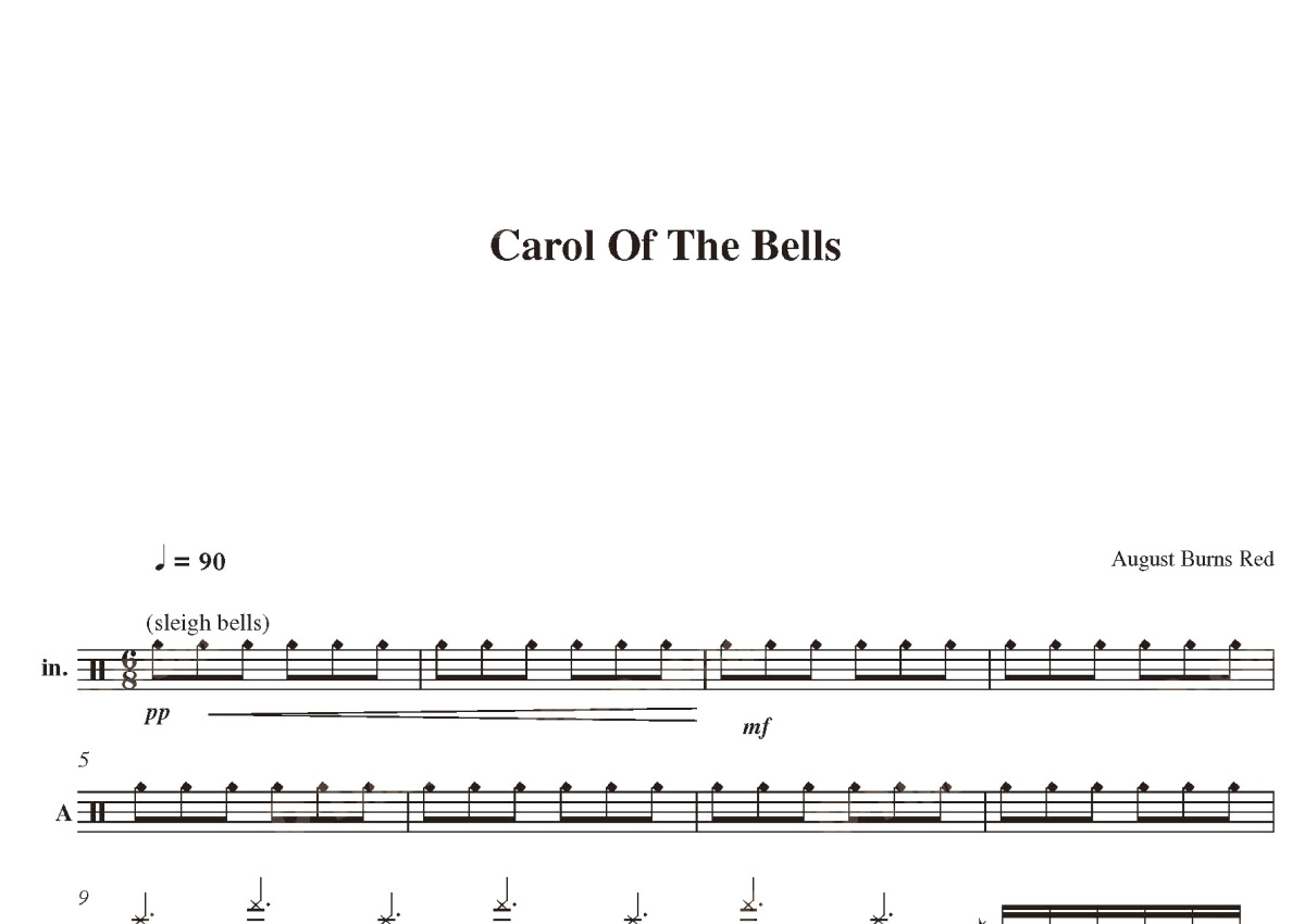 《Carol of the bells》是August Burns Red演唱的一首歌曲,这份鼓谱共有两张高清图谱,图谱由 @打鼓谱 编配上传,图谱使用五线谱编配,使用这份Carol of the bells架子鼓谱,你将能够轻松地敲打出这首August Burns Red的Carol of the bells,快来尝试吧。这首歌最早是一首前基督时期,乌克兰的一首传统的新年圣曲Shchedryk,用于其在每年四月开始的新年庆贺,其后基督教传入乌克兰,这首圣曲便成为乌克兰基督教Feast of Epiphany的庆贺曲,1904年乌克兰作曲家Mykola Leontovych将其改编成一首合唱小品,1916年乌克兰Kiev University的学生合唱团体在其欧美巡演中首次演出了这首曲目,引起欧美听众的喜爱与追捧,1930年Peter Wilhousky将这首曲目改编成英文版本,并配了一首与原曲没有什么关联的歌词,从此这首歌。