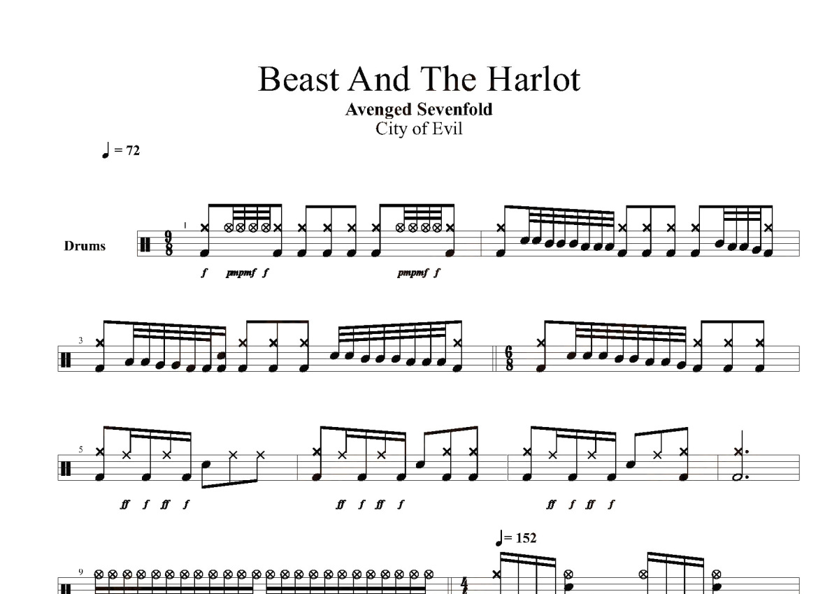 《Beast And The Harlot》是Avenged Sevenfold演唱的一首歌曲,这份鼓谱共有九张高清图谱,图谱由 @打鼓谱 编配上传,图谱使用五线谱编配,使用这份Beast And The Harlot架子鼓谱,你将能够轻松地敲打出这首Avenged Sevenfold的Beast And The Harlot,快来尝试吧。歌曲名:Beast And The Harlot (Radio Edit)