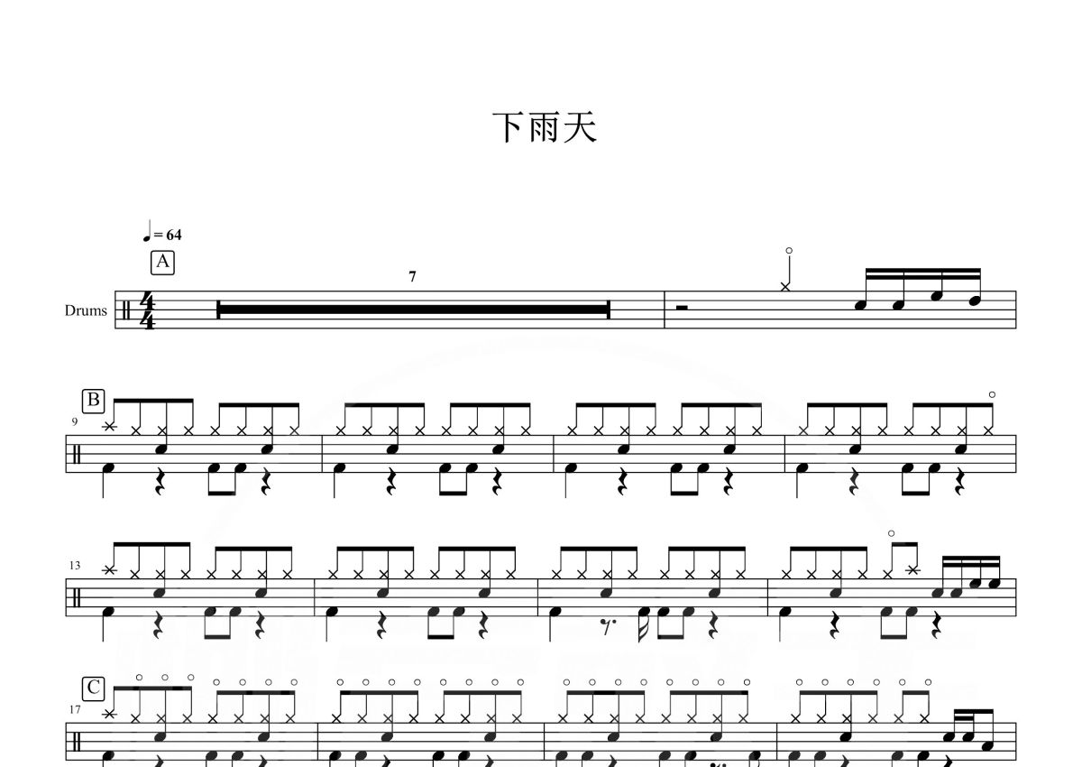 《下雨天》是南拳妈妈演唱的一首歌曲,这份鼓谱共有两张高清图谱,图谱由 @打鼓谱 编配上传,图谱使用五线谱编配,使用这份下雨天架子鼓谱,你将能够轻松地敲打出这首南拳妈妈的下雨天,快来尝试吧。《下雨天》是梁心颐演唱的一首歌曲,由梁心颐填词,张杰谱曲,洪敬尧编曲。收录于南拳妈妈2008年7月25日发行的专辑《优の良曲南搞小孩》中。 2009年,该曲荣获KKBOX年度数字音乐风云榜年度十大单曲奖。
