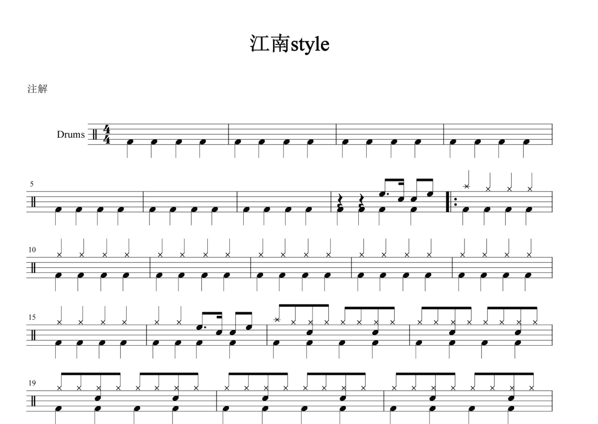 《江南style》是鸟叔(朴载相psy)演唱的一首歌曲,这份鼓谱共有两张高清图谱,图谱由 @打鼓谱 编配上传,图谱使用五线谱编配,使用这份江南style架子鼓谱,你将能够轻松地敲打出这首鸟叔(朴载相psy)的江南style,快来尝试吧。《江南style》(韩语:강남 스타일)是韩国音乐人PSY的一首K-Pop单曲。这首歌曲作为PSY第六张录音室专辑《PSY 6甲 PART1》的主打歌于2012年7月发布,首次进入韩国国家公认音乐排行榜“Gaon Chart”就登上榜首。2012年12月21日UTC15:50左右,《江南style》成为互联网历史上第一个点击量超过10亿次的视频。 2012年9月,这支音乐录像带还打破吉尼斯世界纪录,成为YouTube历史上最受人“喜欢”的视频。