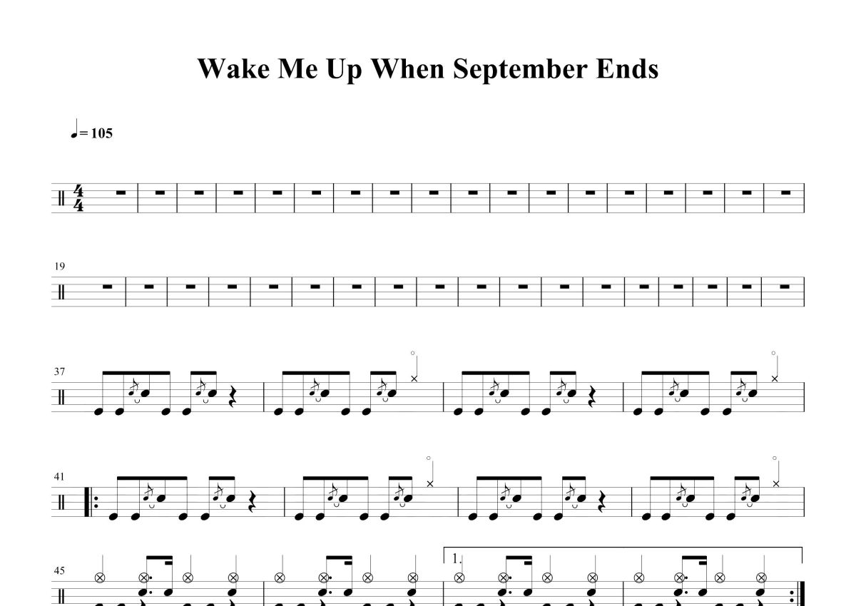《Wake Me Up When September Ends》是Green Day演唱的一首歌曲,这份鼓谱共有两张高清图谱,图谱由 @打鼓谱 编配上传,图谱使用五线谱编配,使用这份Wake Me Up When September Ends架子鼓谱,你将能够轻松地敲打出这首Green Day的Wake Me Up When September Ends,快来尝试吧。《Wake Me Up When September Ends》是美国摇滚乐队绿日的一首歌曲,歌词、曲谱由比利·乔·阿姆斯特朗创作。歌曲发行于2005年6月13日,被收录在乐队第七张专辑《American Idiot》中 。