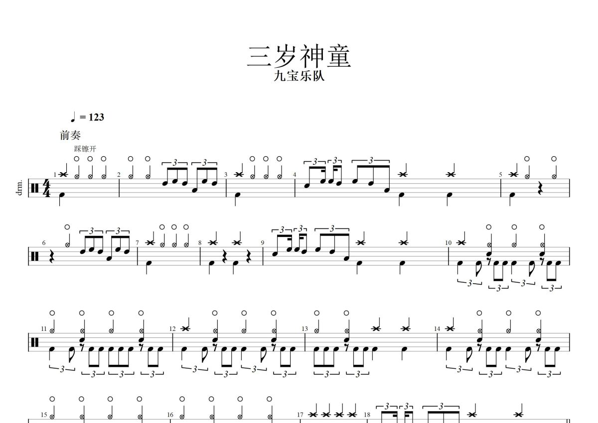 《三岁神童》是九宝乐队演唱的一首歌曲,这份鼓谱共有四张高清图谱,图谱由 @打鼓谱 编配上传,图谱使用五线谱编配,使用这份三岁神童架子鼓谱,你将能够轻松地敲打出这首九宝乐队的三岁神童,快来尝试吧。由 九宝乐队 演唱,收录于《Awakening From Dukkha》专辑中,《三岁神童 (重新录制)》下载,《三岁神童 (重新录制)》在线试听,更多三岁神童 (重...。